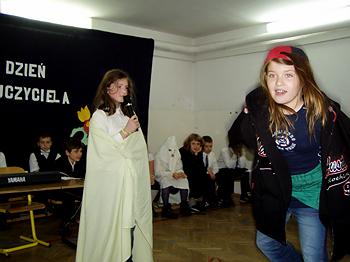 14 października o godzinie 10.00 nauczyciele, przedstawiciele Rady Szeryfów oraz uczniowie, reprezentujący poszczególne klasy zebrali się, aby świętować Dzień Edukacji Narodowej. Jak zwykle w naszej szkole część artystyczną przygotowywały klasy czwarte, w tym roku pod kierunkiem wychowawczyni – Pani Basi Kamińskiej i nauczycielki polskiego – Pani Joasi Piechny. Na scenie pojawiły się różne uczniowskie typki, a nawet duch. Po krótkim występie uczniowie wręczyli kwiaty, laurki i złożyli życzenia wszystkim nauczycielom. Na koniec części oficjalnej wszyscy zebrani stanęli do pamiątkowego zdjęcia. Później pan dyrektor zaprosił uczniów i nauczycieli na wspólny poczęstunek do jadalni.