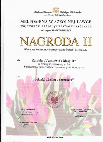 Radości było co nie miara, gdy ogłoszono, że nasz spektakl zajął II miejsce. Otrzymaliśmy statuetkę – „Srebrny Ikar”, dyplom okolicznościowy oraz nagrodę rzeczową – aparat cyfrowy. Ponadto jury wytypowało nasz spektakl do udziału w Festiwalu „Dziecięca Stolica”, który odbędzie się 21 maja 2006 r. Bardzo jesteśmy dumni i zadowoleni.