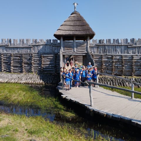 We wtorek, 17 września, niemal o świcie około 40 dzieci z klas trzecich zgromadziło się punktualnie na parkingu przy ulicy Raginisa, nieopodal naszej szkoły. Już o 6:30 ruszyliśmy w kierunku Biskupina- niezwykłego pomnika historii. Osada ta zbudowana w epoce brązu, a zrekonstruowana w XX wieku, przywitała nas radosnym gwarem. Powstał on w ramach XXIX Festynu Archeologicznego. Jest to wyjątkowe wydarzenie, odbywające się raz w roku i ściągające rzesze turystów oraz miłośników historii. Dzięki imprezie uczestniczyliśmy w rekonstrukcji walk wojów, oglądaliśmy i dotykaliśmy wyposażenia wojennego, poznaliśmy smak ziołowych podpłomyków, przyglądaliśmy się zgrabnym ruchom sokolników czy wybijaliśmy monety w zagrodzie mincerza. Otaczały nas niezwykłe zapachy i dźwięki, a nasze oczy cieszył widok dawnych strojów. Wobec tylu atrakcji ciężko było się skupić na spotkaniu z przewodnikiem Muzeum Archeologicznego. Jednak możliwość wejścia do chaty i dotykania obecnych tam przedmiotów dla każdego była sporym przeżyciem.